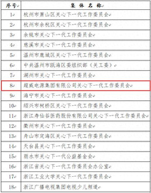 超威集团自2014年成立关工委以来,始终将关心下一代工作作为企业社会责任的重要组成部分,建立了完善的企业关心下一代工作组织体系和制度,常态化开展校企共建、光彩助学、科普教育和资助青少年文化体育事业发展等工作,用十年如一日的坚持,为青少年健康成长撑起了一片蓝天,2020年获评“湖州市关心下一代工作先进集体”,2024年获评“浙江省关心下一代工作成绩突出集体”。
